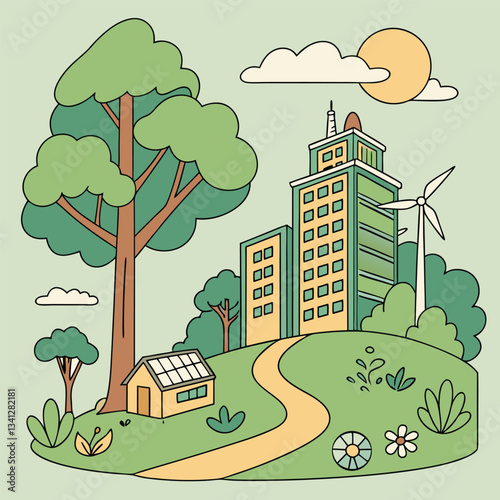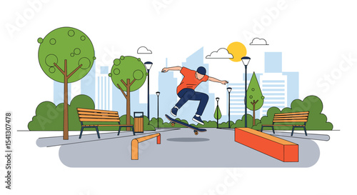 Autumn season. Man janitor cleaning street from autumn leaves with broom, flat vector illustration. Fall scenery. Street cleaner working in city park.