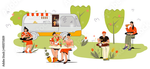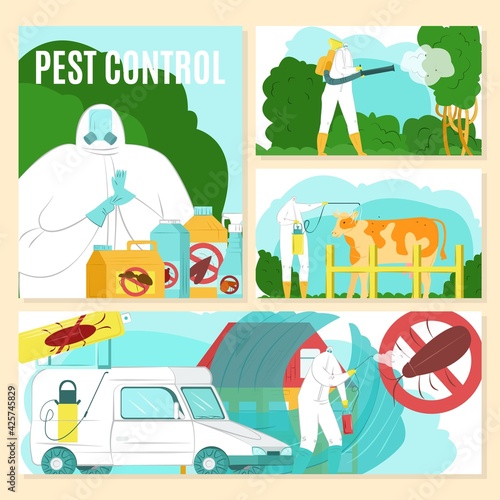 Autumn season set, flat vector illustration. People enjoying fall, walking dog, cleaning falling leaves in the park, picking pears from tree in garden, walking under the rain, celebrating Halloween.