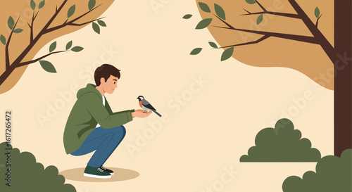 Autumn season. Girl under umbrella walking in the rain, flat vector illustration. Young woman wearing coat and rubber boots walking along the street. Fall scenery. Rainy autumn weather.