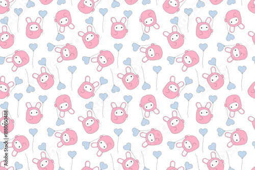 Vector seamless pattern with cute bear holding milk bottle, stork with newborn, baby clothes and accessories. Baby shower background, wallpaper, fabric, wrapping paper.
