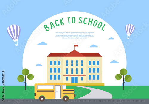 Back to school paper cut craft style vector background. School bus driving on road with city pencil house apartment. Modern origami teaching and learning illustration design