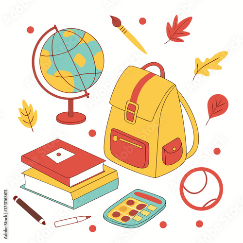Back to school paper cut vector illustration. First september card in craft style. Knowledge day poster with layered effect. Maple, oak leaves and study accessories with round empty copy space for text