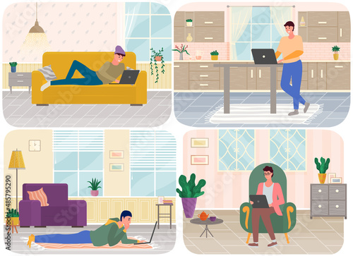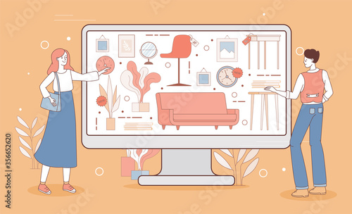 Bad dog and puppy behavior problem vector illustration. Naughty pet in dirty messy room with damaged furniture and frustrated upset man woman owner characters