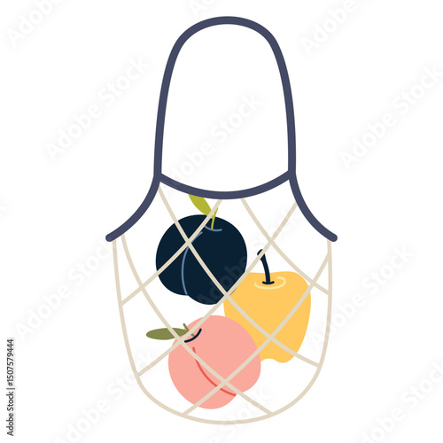 Bag mesh net with fruit vector. Food market, eco purchase and grocery shopping icon isolated on white background
