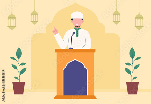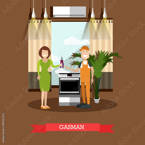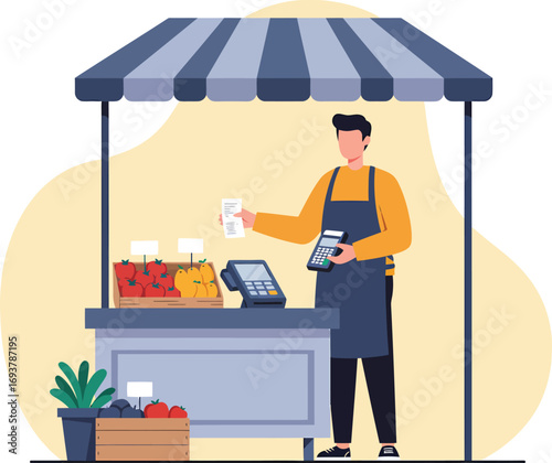 Vector illustration of confectioner holding plate with slice of cake. Coffee house, bakery or candy store interior. Baker flat style design element.