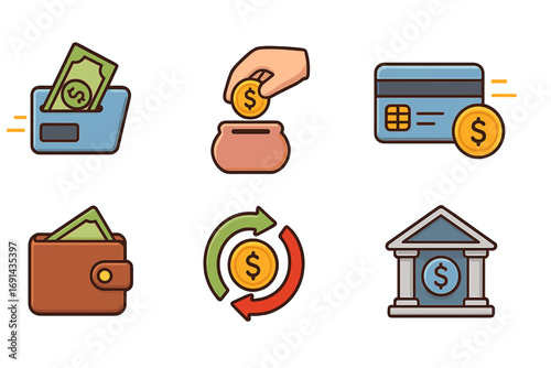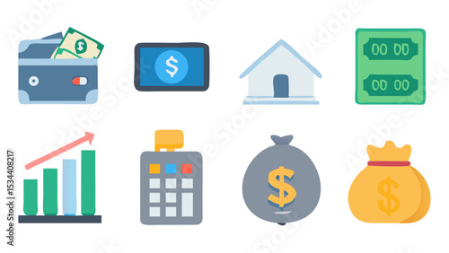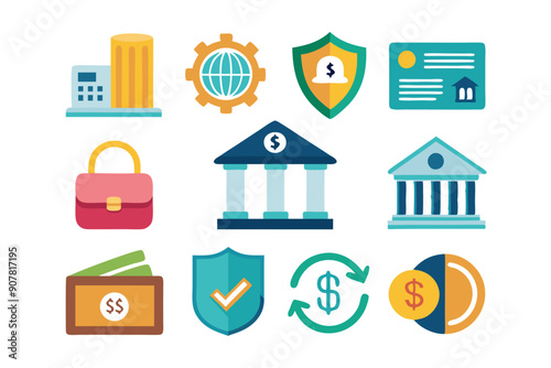 Bank, money and finance business icon set. Vector coin, credit card, wallet, currency for payment sign. Financial exchange, cash, building, briefcase and calculator isolated illustration