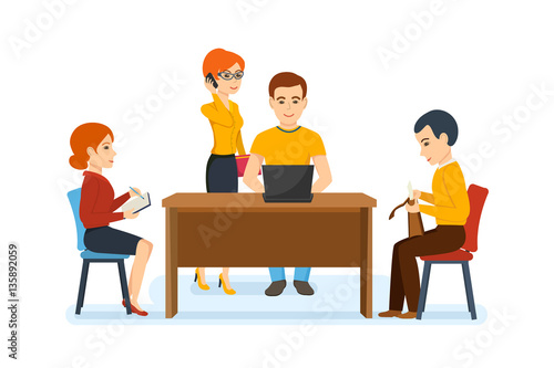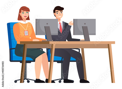 Vector illustration of bank personal manager female and customer male. Bank people concept flat style design elements, icons isolated on white background.