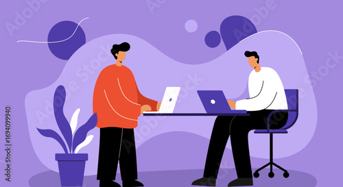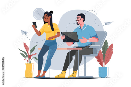 Barbers male and female characters doing man hairstyle with hairdryer and comb, vector illustration. Barbershop man beauty parlour salon services concept for web banner, website page etc.