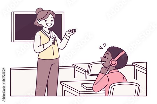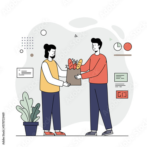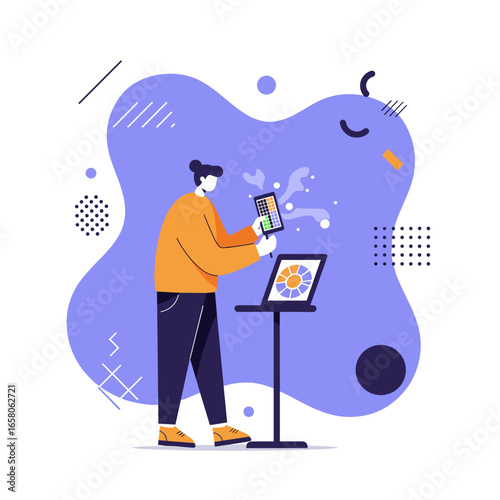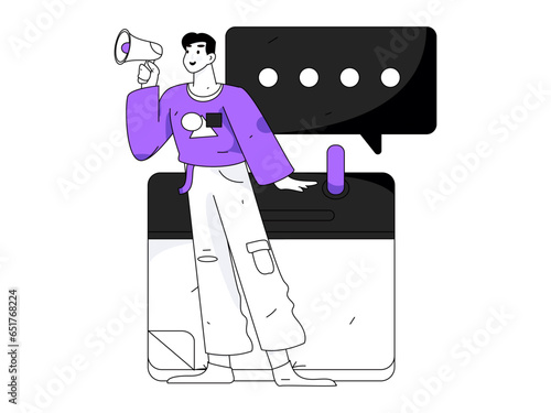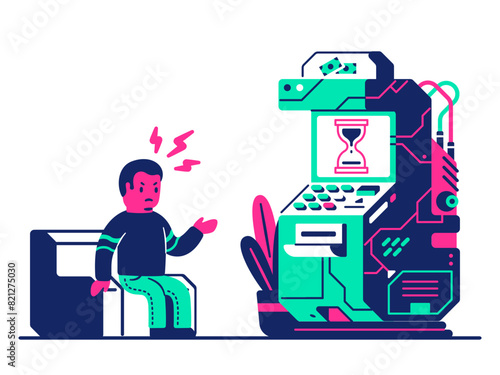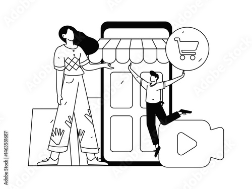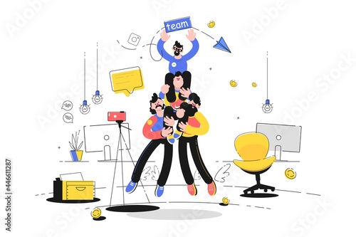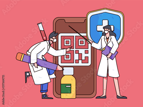 Huge man face and micro male characters with barber tools for beard grooming such as razor, aftershave, shaving brush with foam, scissors, vector illustration. Barbershop concept for website page etc.