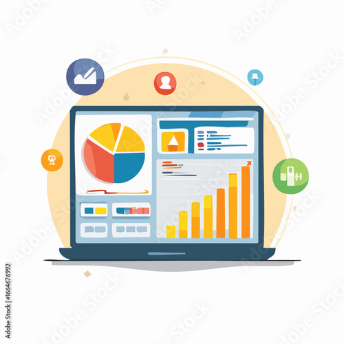 Barrel of oil price chart vector illustration in flat style. Stock chart on laptop screen. Pile of money, oil tanks.