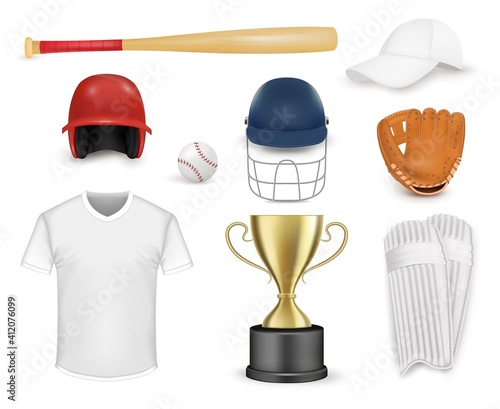 Baseball equipment set, vector isolated illustration. Realistic baseball player uniform, catcher gear. Cap, t-shirt, bat, ball, softball glove or mit, batting helmets, leg guards and winner cup.