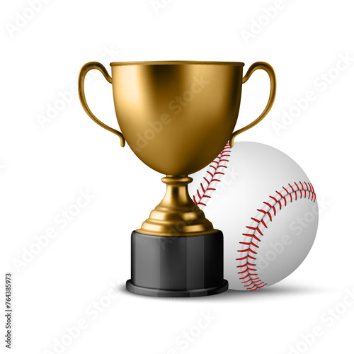 Baseball sport game championship winner award, vector illustration. Realistic gold cup, baseball mitt, helmet, ball and bat on transparent background.