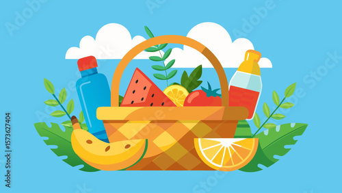 Basket with food vector illustration. Organic fruits and vegetables from grocery store. Hand drawn cartoon with set of fresh food products.