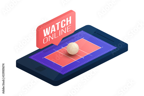 Basketball online concept vector illustration. Isometric basketball field, ball and indicator board placed on smartphone screen.