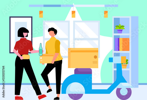 Bathroom interior and girl taking shower, vector flat illustration. Modern shower stall, washbasin, mirror and lights. Woman bathroom interior.