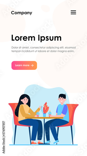 Man chef cooking bbq meat, happy couple enjoying drinking red wine, vector illustration. Outdoor barbecue party, romantic date, summer picnic concept for web banner, website page etc.