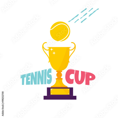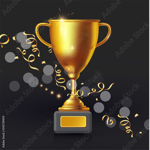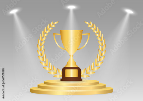 Be a winner poster web banner template. Vector illustration of golden cup standing on white round podium. Competition winner trophy award, championship victory reward.
