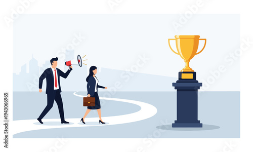 Be first vector poster web banner design template. First place competition winner white round podium with trophy award cup illuminated by floor spotlights.