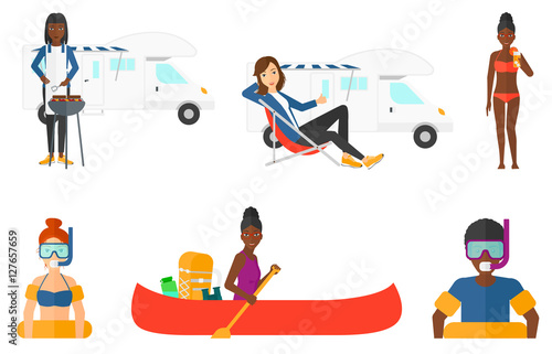 Vector illustration of tourists or vacationists taking rest on the beach. People playing frisbee, surfing, riding jet ski. Summer people symbols, icons isolated on white background. Flat style design.