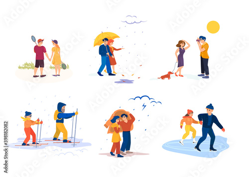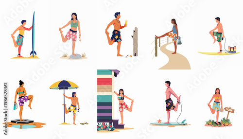 Beach party cartoon character set flat vector isolated illustration. Dj playing disco music, barmen pouring beer, people swimming in pool, floating in rubber ring, dancing, having fun. Summer vacation