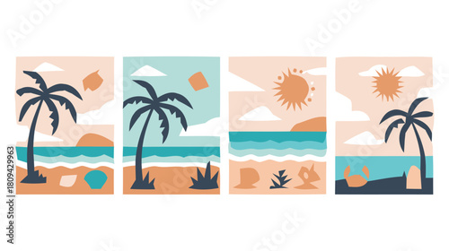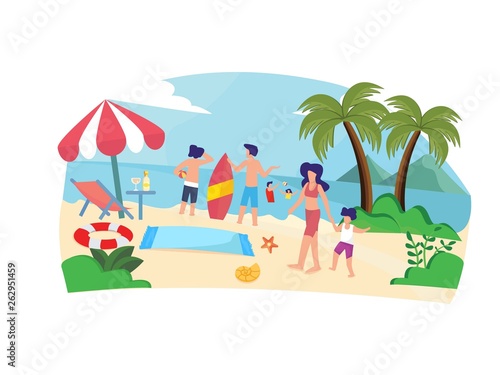Beach party with dj playing disco music, flat vector illustration. Happy man and woman cartoon characters dancing to music on beach and having fun. Summer travel, tropical vacation, friendship.