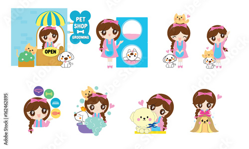 Beautiful princess in crown icon set. Vector illustration isolated on white background. Fairytail girl riding unicorn, holding cat, listening to music, eating ice cream, posing and having fun.