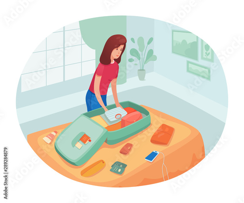 Beautiful woman doing makeup at home concept vector illustration. Table with a mirror for make up. Red lipstick, makeup accessories, cosmetic products.