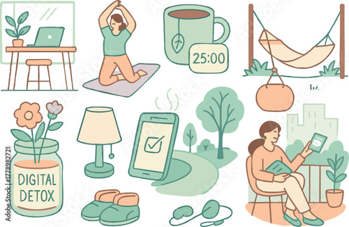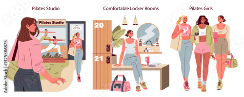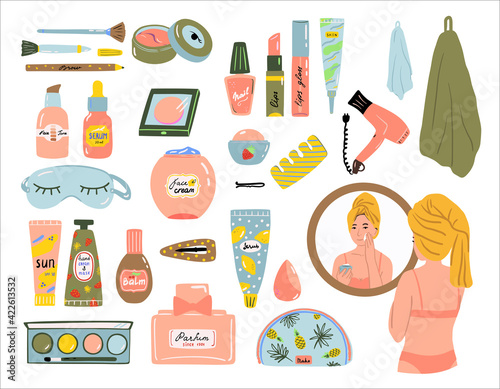 Beautiful woman make up and clean her face. Girl comb hair in front of mirror in bathroom. Skincare daily routine and cosmetic vector poster.