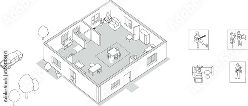 Bedroom interior creator. Vector isometric cutaway empty room and with modern furniture in linear style. Bedroom constructor.
