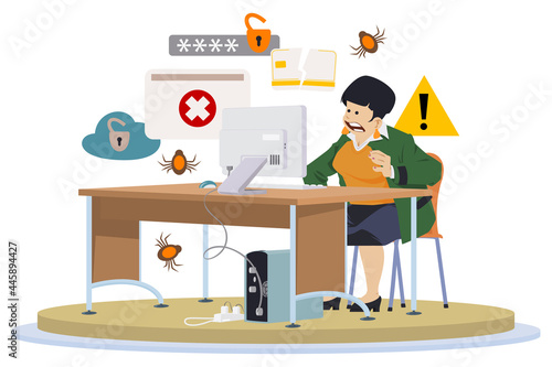 Bedroom interior and girl sleeping in bed by the window, vector flat illustration. Cozy woman bedroom with furniture and decoration, modern home interior.