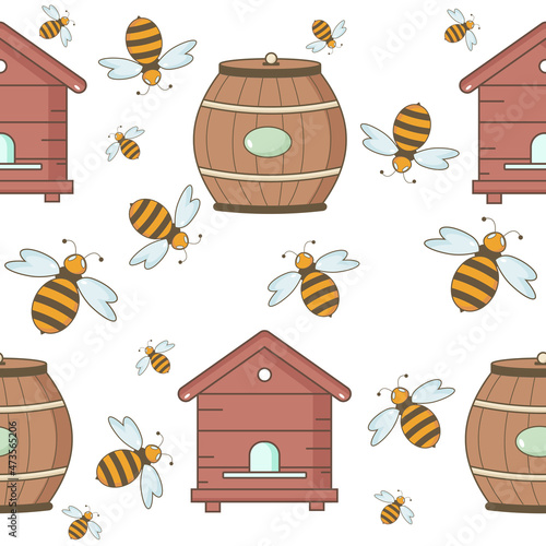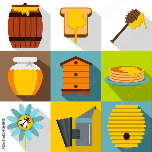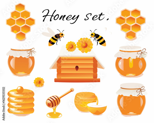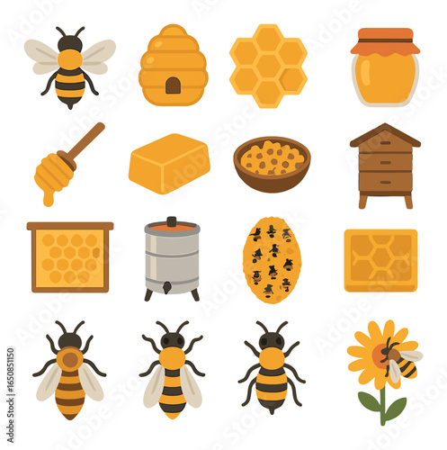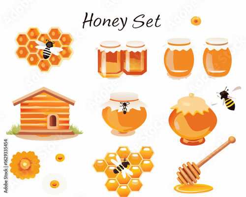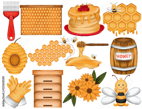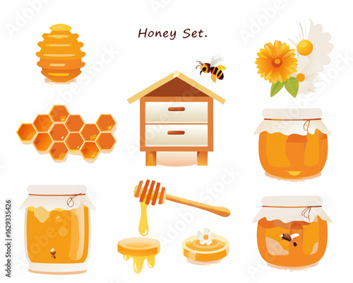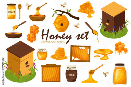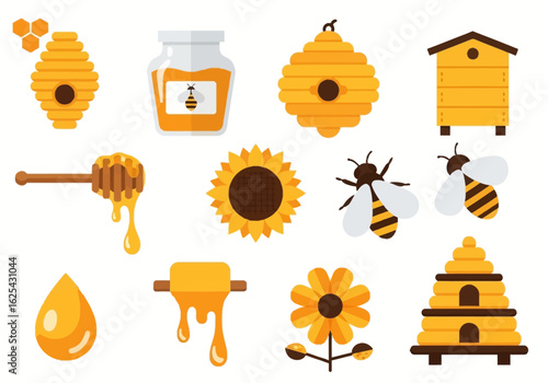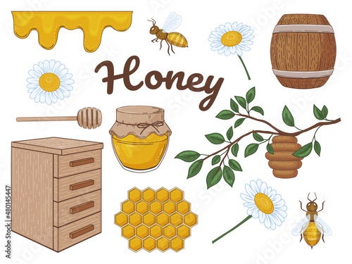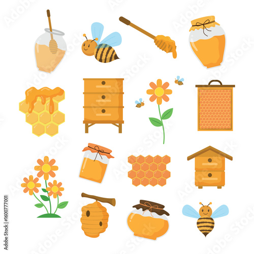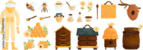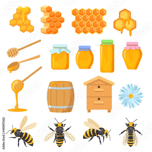 Beekeeping set, flat vector illustration. Beekeeper cartoon characters, beehive, bee, honeycombs, honey jar, dipper, barrel flowers. Healthy sweet syrup. Beekeeping farm. Honey bee farming business.