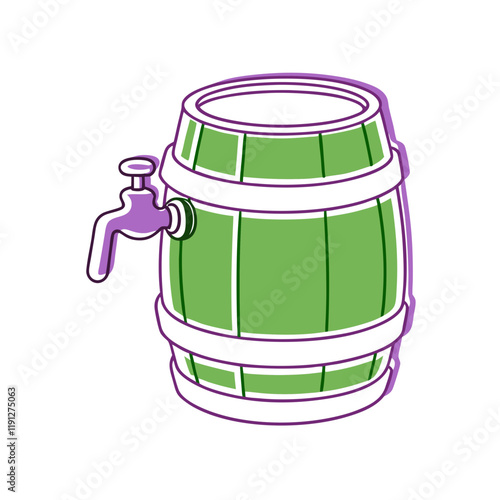 Big wooden barrel and tiny characters young men with dried fish, hop, beer glass, vector illustration. Craft brewery or pub, beer party composition for web banner, website page etc.