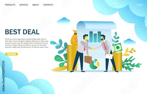 Best deal vector website template, web page and landing page design for website and mobile site development. Two businessmen making a deal and shaking hands. Partnership, signing contract concept.