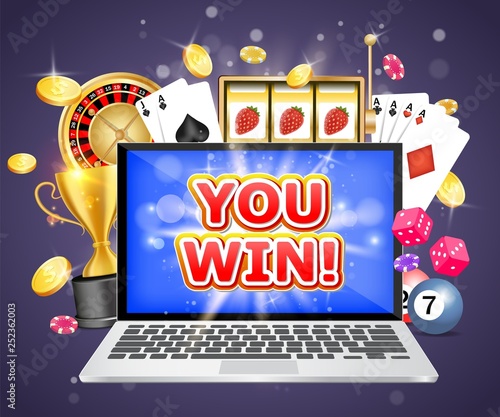 You win, vector poster banner design template. Laptop, soccer basketball baseball balls, stopwatch, hockey puck, yellow and red referee cards, trophy cup and coins. Sports betting winner concept.