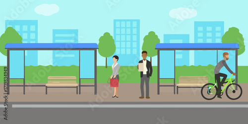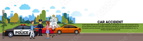 Bicycle accident cyclist collision with car, vector flat illustration. Paramedic emergency medical team rescuing injured patient transporting him to hospital on stretcher. Traffic accident, bike crash