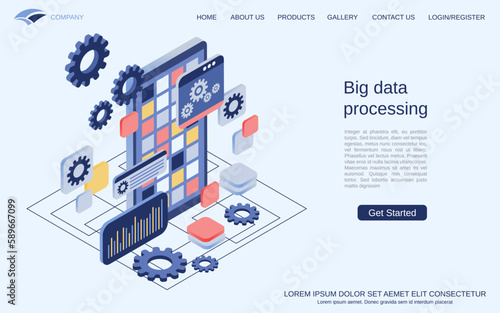 Bicycle online shop landing page website template. Vector isometric illustration of man doing shopping via smartphone. Online shopping, e-commerce concept.
