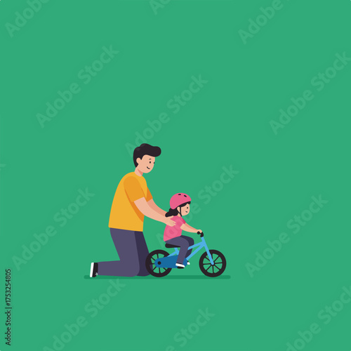 Vector illustration of father teaching his son to ride a bicycle. Childcare and parenting concept flat style design element.