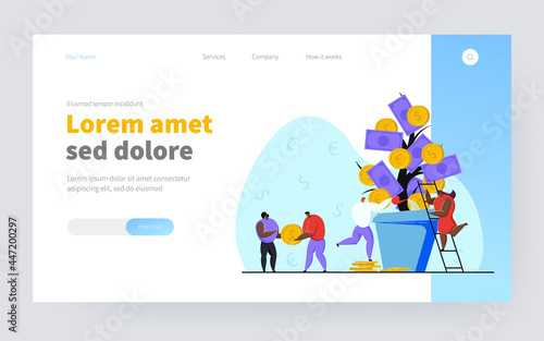Bingo game vector website template, web page and landing page design for website and mobile site development. Huge balls with lucky numbers, raffle drum and tiny characters lottery winners.