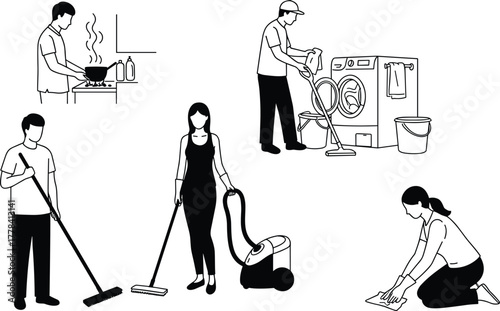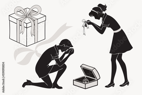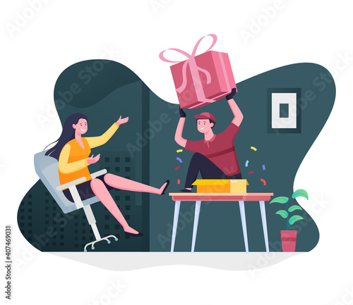 Tiny characters packing birthday cake into big box, vector illustration. Bakery, birthday planning, confectionery composition for web banner, website page etc.