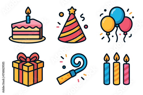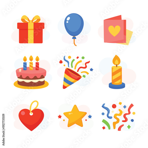 Birthday party icon vector isolated flat set. Greeting card, gift, hat, sweet cake with candles decoration, confetti, chocolate and balloons illustration