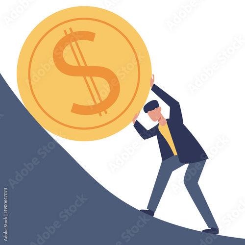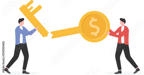 Bitcoin growth concept vector illustration. Businessmen pushing up golden coins with dollar, euro, yen, pound symbols, bitcoin is ahead of the other currencies.