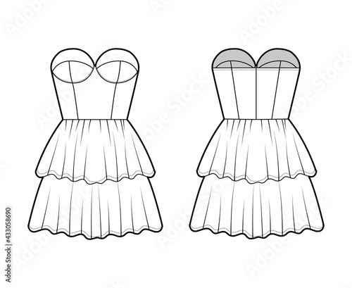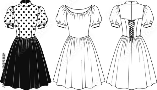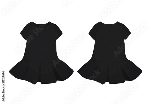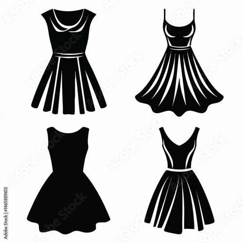 Black and white fluffy dress mockup set, vector illustration isolated on transparent background. Realistic women little cocktail dresses. Ladies clothing and fashion.