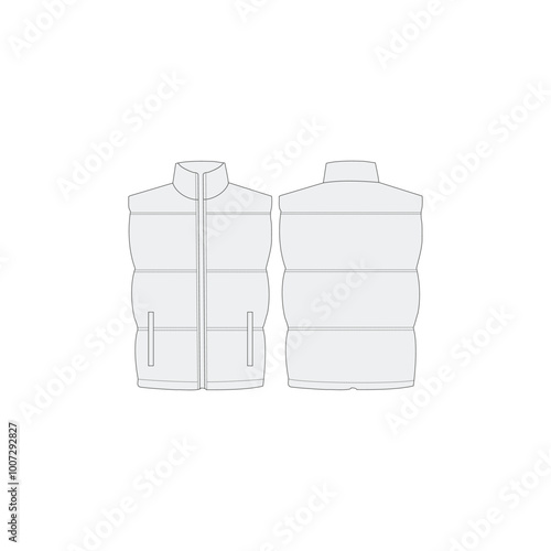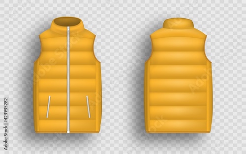 Black winter puffer vest, sleeveless jacket mockup set, vector illustration isolated on transparent background. Realistic warm waistcoat, down padded vest, front and back view.