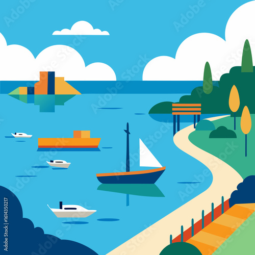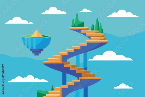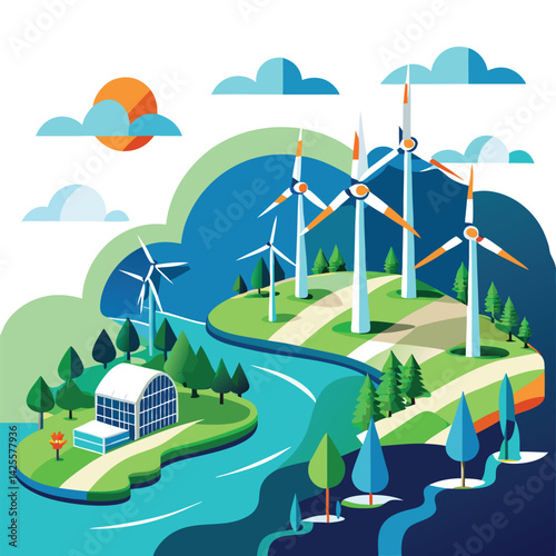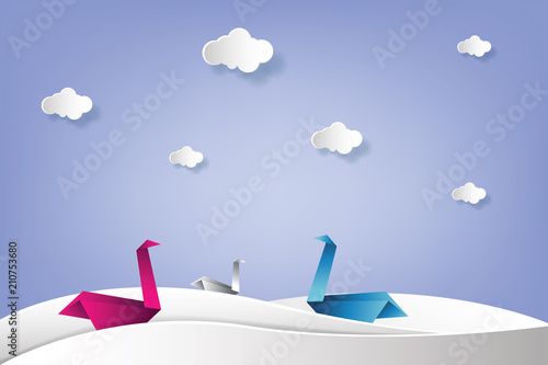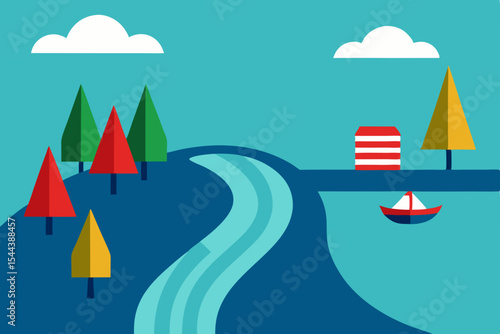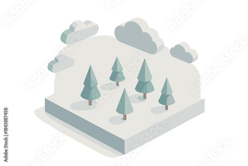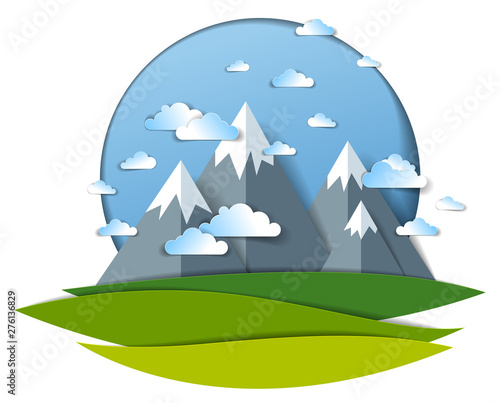 Blank drink water plastic bottle, paper cut mountains, forest trees, vector illustration. Clean drinking water ads template.