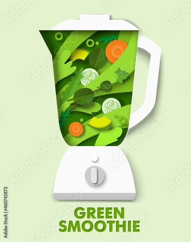 Blender with delicious vegetable smoothie, vector paper cut illustration. Healthy drink made of cucumber, carrot and greens. Food rich in vitamins and minerals. Green smoothie poster, banner template.