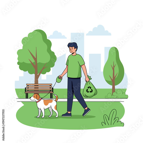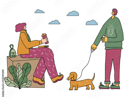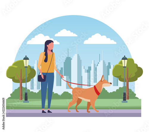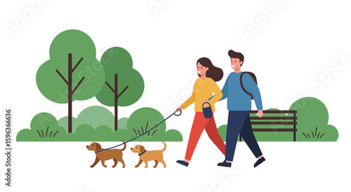 Blind woman walking with stick and guide dog in city park, flat vector illustration. Disabled girl with pet dog companion. Pets assistance for person with visual impairment.