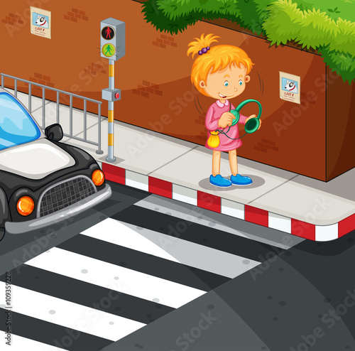 Blind woman with cane crossing street at the lights and crosswalk flat vector illustration. Tactile warning tiles on pedestrian crossing for the blind. Traffic safety for people with visual impairment