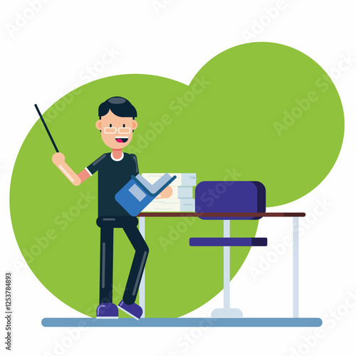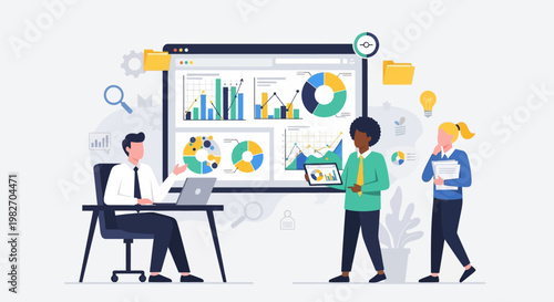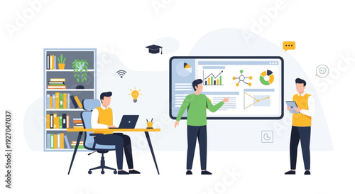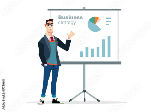 Vector illustration of businessman speaker giving presentation of what is blockchain technology using visual aids. Business conference meeting concept. Flat style design.