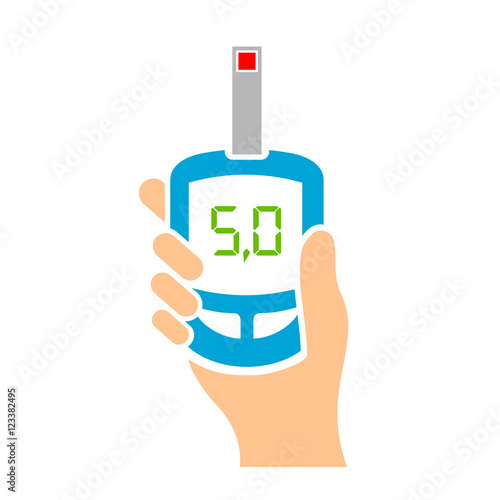 Blood sugar level test with glucometer, diabetes insulin control device, meter, flat vector illustration. Diabetes mellitus diagnosis, blood glucose monitoring.