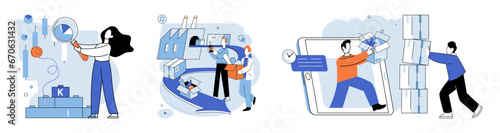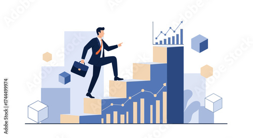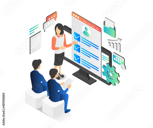 Blue office computer with future technology ip dashboard, business people. Vector illustration for business vision, strategy, analysis, futuristic technologies web banner, website page etc.